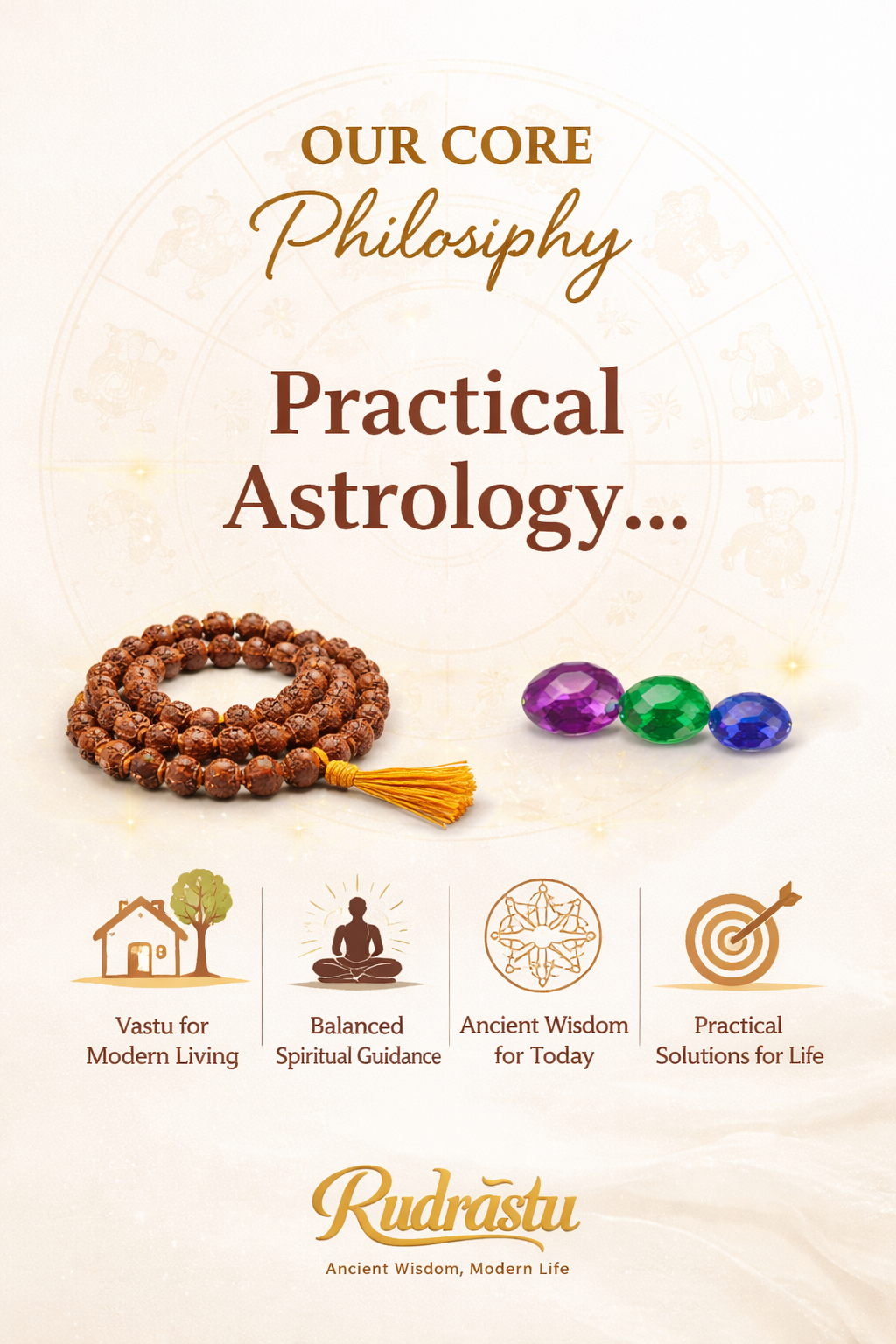 At Rudrastu, we bridge the timeless wisdom of Astrology, Vastu Shastra, Rudraksha, Gemstones, Tantra and Yogic sciences with the practical demands of modern life. Our approach is not ritualistic or fear-based—it is result-oriented, logical and deeply personalized.