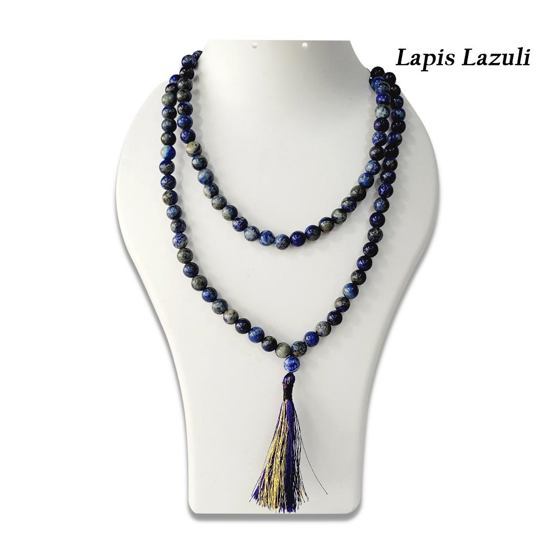 The mala is made of 108 Lapis Lazuli gemstone beads + 1 guru bead. It is very carefully knotted by hand with a colour matching thread. Malas are also said to be Prayer beads and are used for counting the recited mantras. Many temples have 108 steps, and it is said that each person has 108 lives. And a mantra works after 108 repetitions.